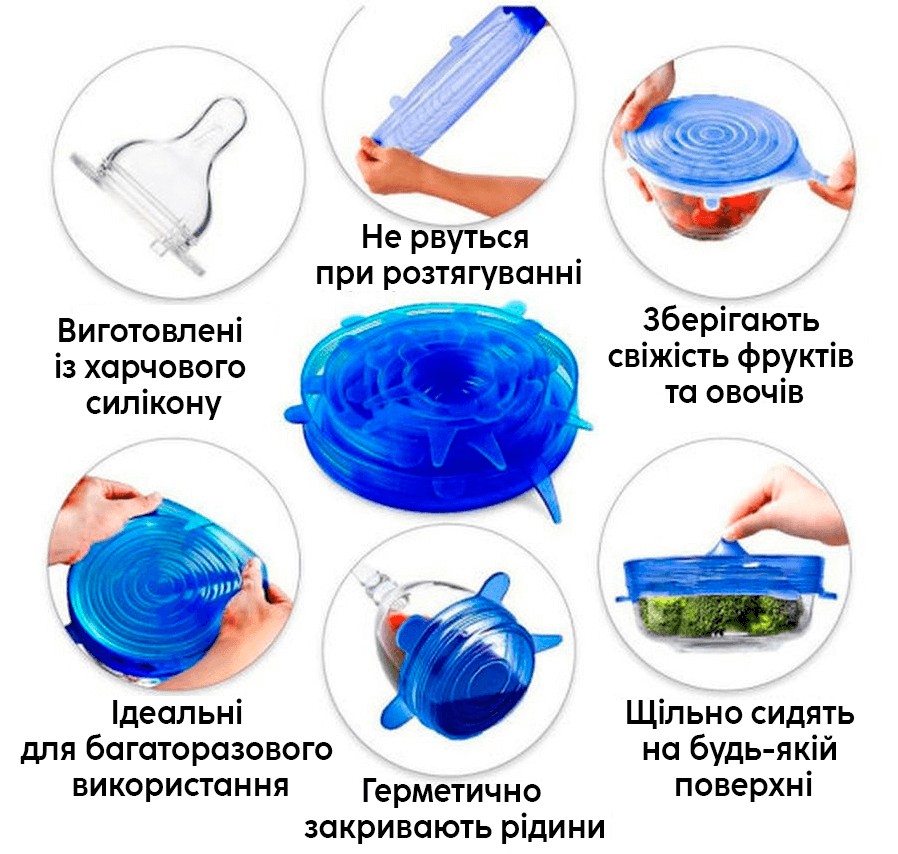 Силіконові кришки добре тягнуться, їх можна одягати на тарілки, каструлі, банки, контейнери, а також на самі продукти, наприклад, на половинку кавуна або дині.