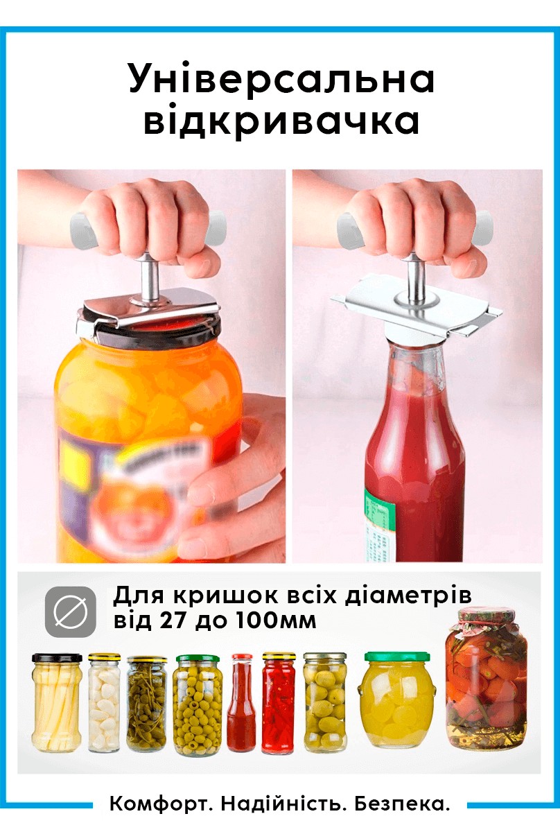 Універсальна відкривачка кришок виготовлена з нержавіючої сталі. Вона легко допоможе відкрити будь-яку банку. Пристроєм неможливо пошкодити ні банку, ні кришку.