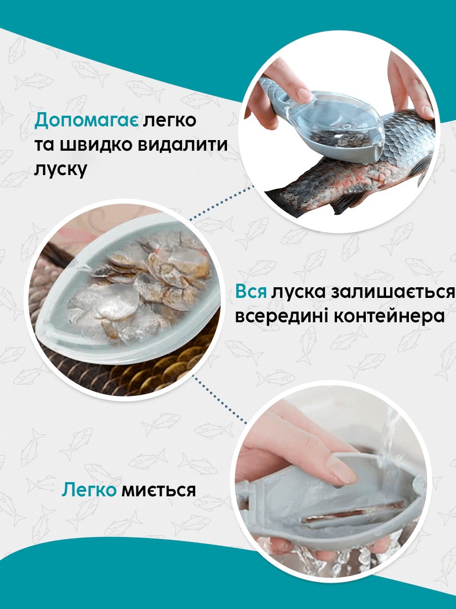Рибочистка з контейнером (ніж для чищення риби) - сучасний кухонний девайс для безпечного та швидкого чищення риби. Швидко справляється з чищенням різних видів риб, навіть із великою лускою.